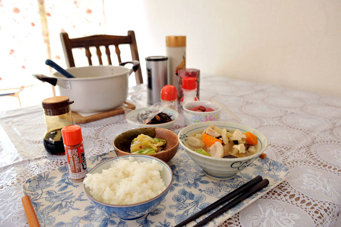 食卓には「温めて食べてください。ごはんはジャーです。おしんこは冷蔵庫」のメモ。