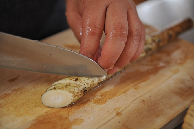 厚めに、斜めに切ります。