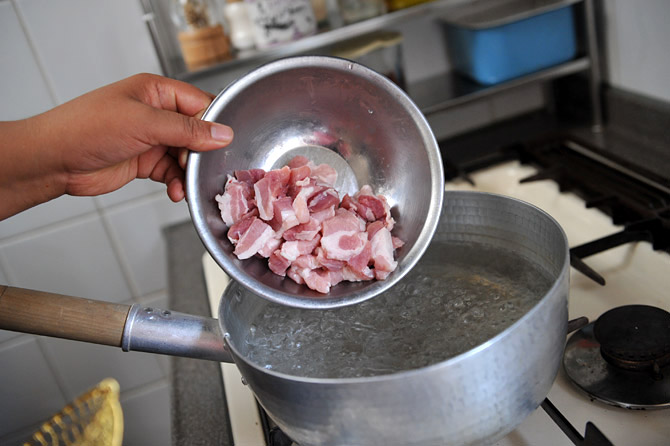 沸騰したお湯に、豚肉を入れます。