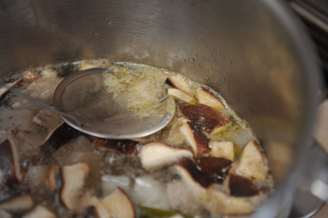 沸騰すると、アクが出るので、ていねいにすくいます。