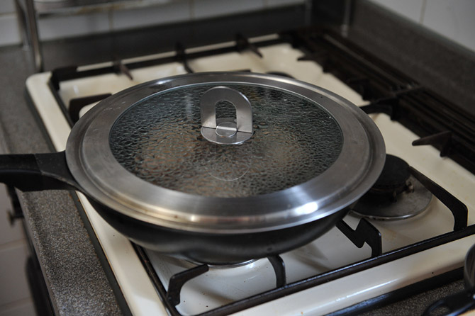 中火の弱めで1分焼いたら、フタをして、弱火にして、