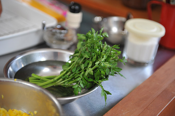 最後に添えるクレソンは、「5分の加熱」の間に準備しましょう。