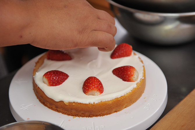 半分に切ったいちごを、並べていきましょう。