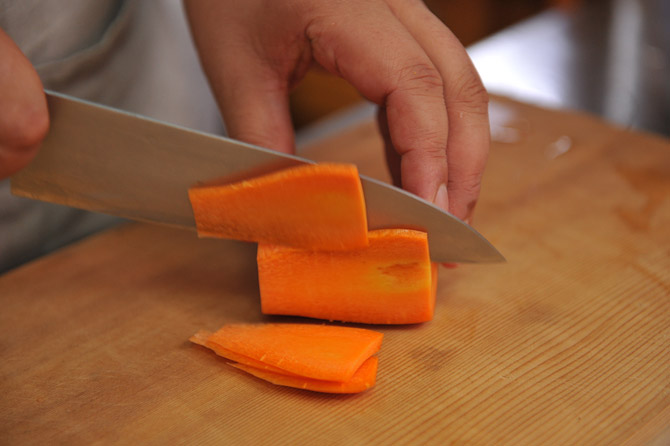 にんじんの皮をむいて、まずはスライス。