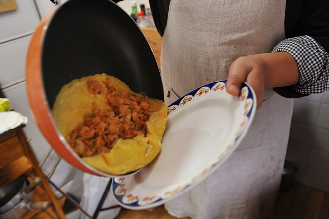 そうなんです、お皿を斜めに、フライパンも斜めに、