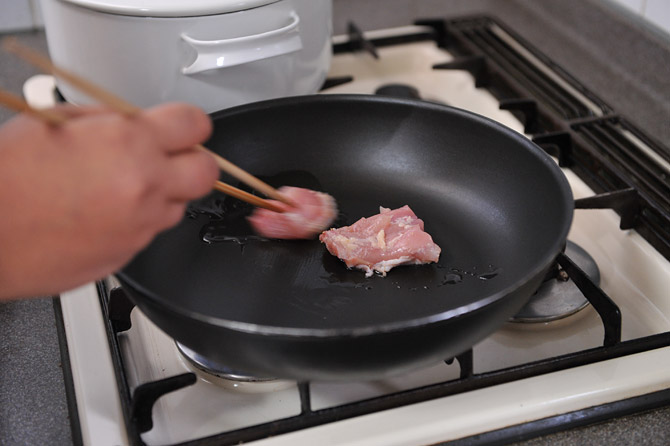 フライパンに大さじ1の油をひいて鶏肉を焼きます。