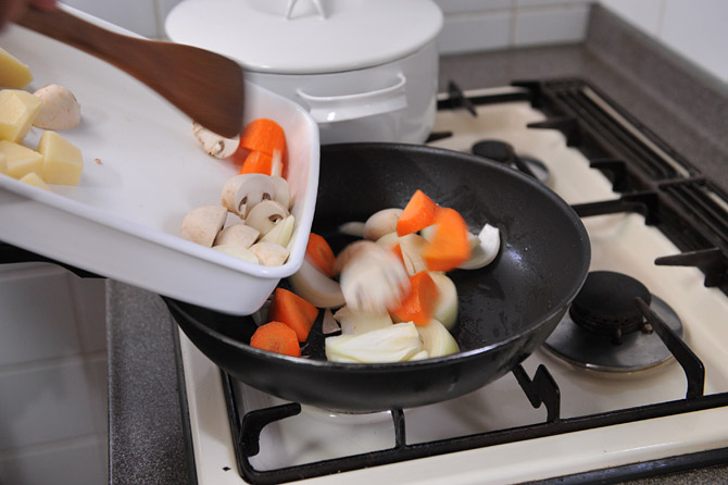 にんじん、たまねぎ、マッシュルームを炒めます。