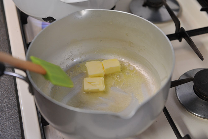 バター大さじ3を、鍋に入れ、弱火で溶かします。