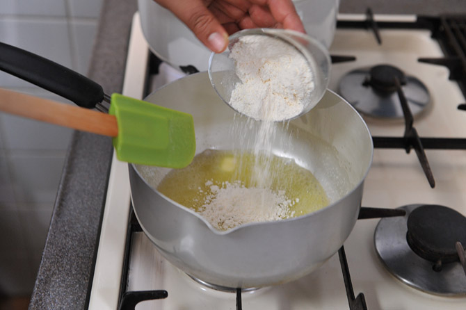 ほぼ、溶けたところに、小麦粉大さじ3を入れます。