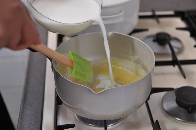 ひと肌に温めておいた牛乳400ccを一気に入れます。
