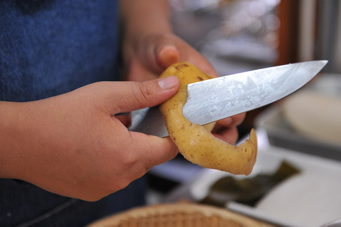 じゃがいもは、洗って、皮をむきます。
