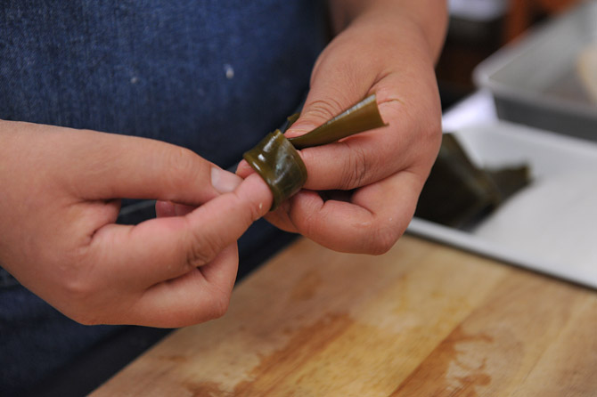 あらかじめ水につけておいて、半分に折ってむすびます。
