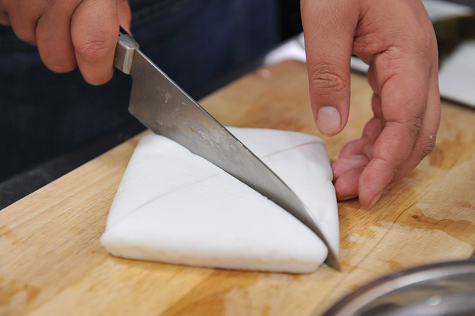 はんぺんは、1枚を4等分に、三角形に切ります。
