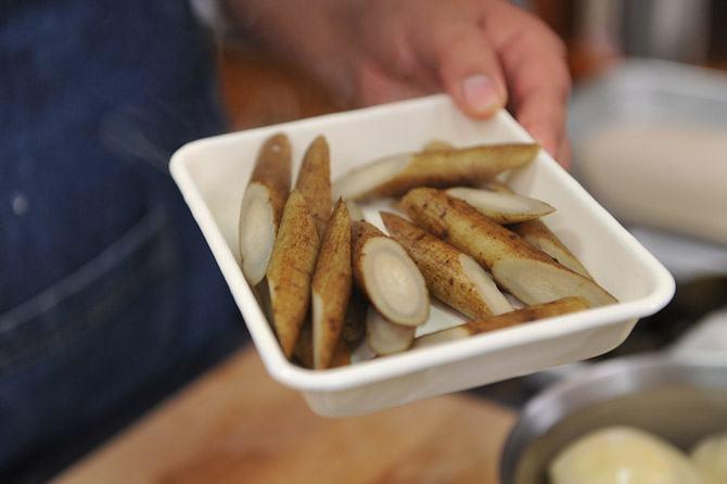 ごぼう。洗ってから、皮ごと、斜めに切って、