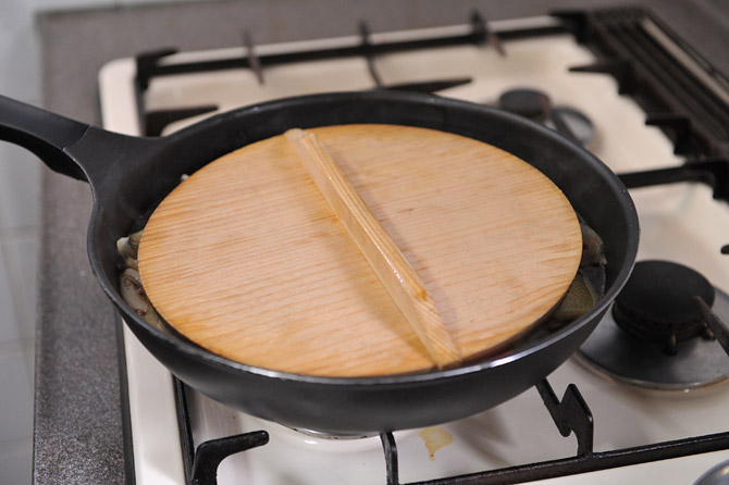 鍋よりひとまわり小さく切ってのせ、底が平らな鍋のフタがあれば上にのせます。