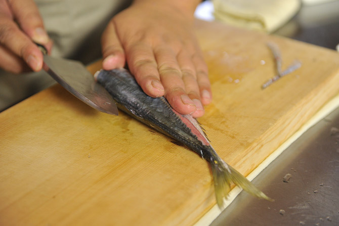 しっかりとおさえて、背に包丁を入れます。