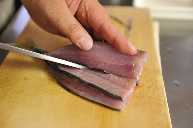 こちらも、腹が切れないように、ぎりぎりまで包丁を入れましょう。