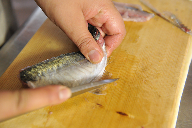 背に残っているヒレを包丁でおさえ、魚を横にひっぱると、