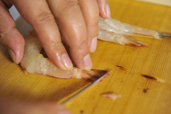 さらにしっぽの水分を、包丁でしごいて出します。