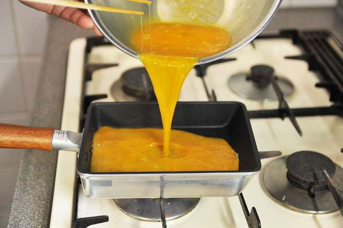 強火にかけたまま、半量の卵を入れます。