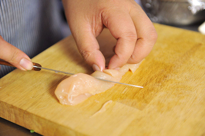 すじを取ったササミを、5ミリの厚さの、そぎ切りにします。