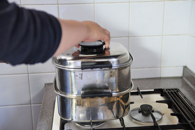 強火で1分、そのあと弱火にして13〜15分蒸します。