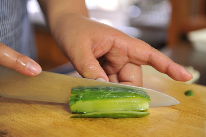 冷蔵庫に余っているような漬物を、5ミリの厚さにスライス。