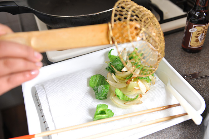 網と、キッチンペーパーをのせたバットで、油を切りましょう。