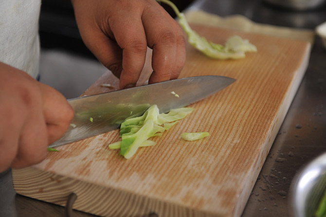 芯の部分は、3ミリの厚さで、斜め切りにします。