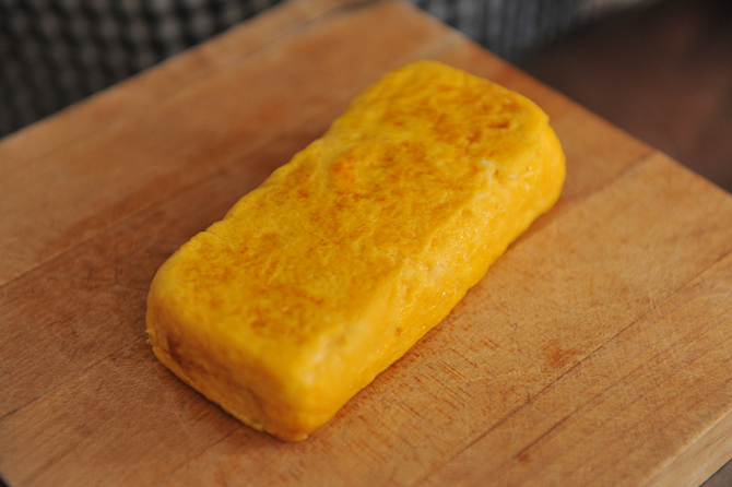 卵焼きは、厚みを半分にしてから、タテ3等分にしておきましょう。