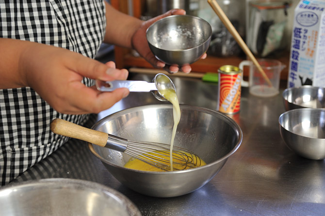 さきほどの卵液に、とかしバターを入れます。
