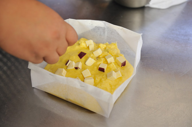 上に、残りのさつまいもをちりばめます。