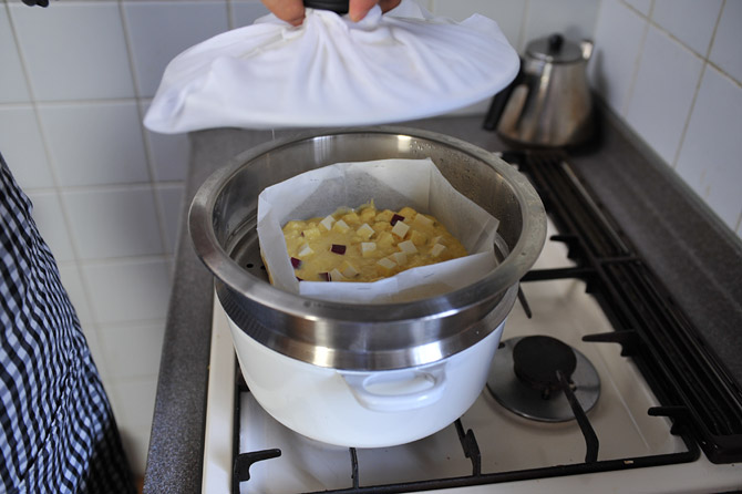 ふたを、さらしやふきんで巻いて、