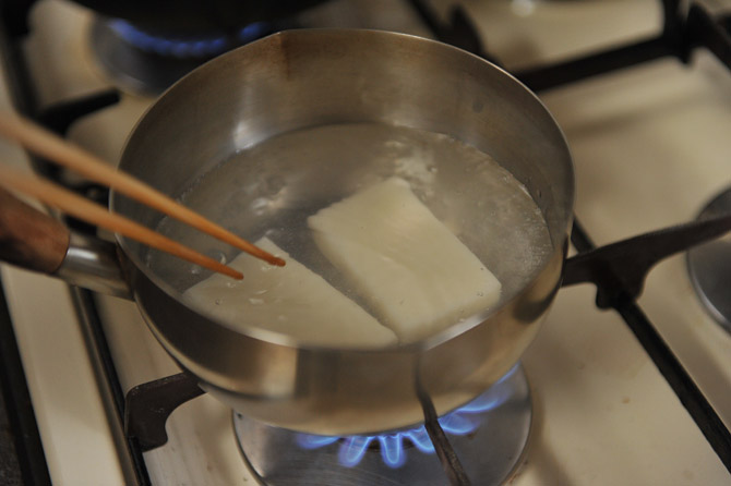 熱湯におもちを入れて、ふたたび沸騰したら弱火にして3分。