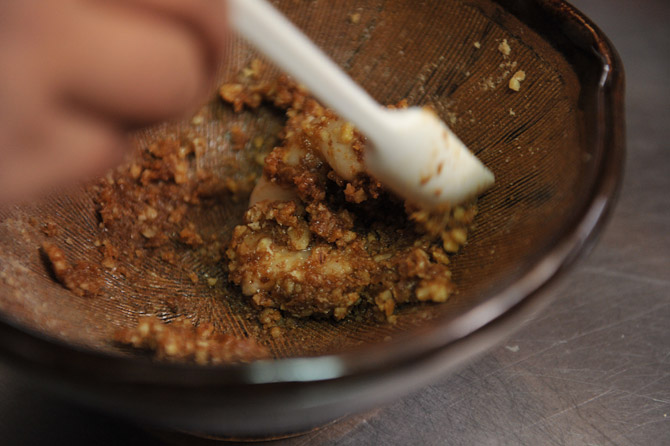 おもちが、くるみあんをまとったら、お皿に盛りつけます。