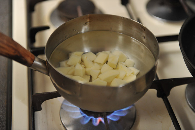 小鍋に水をはり、じゃがいもを入れて、火にかけます。