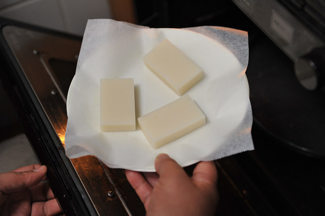 おもちは、クッキングシートにのせて、電子レンジへ。