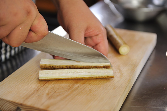 ごぼう。これも、ゆでた大豆と同じくらいの大きさにします。