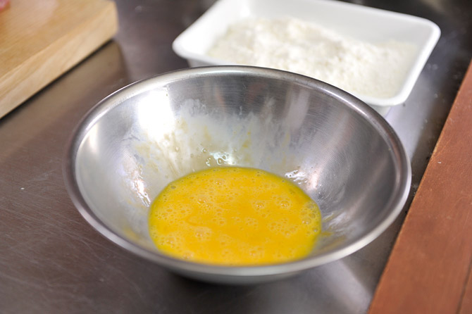 ひとつは小麦粉、もうひとつにパン粉を用意しておきましょう。