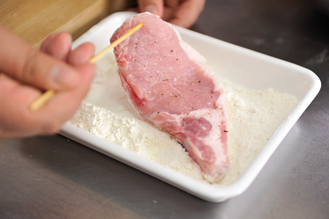 豚肉に竹串を刺し、