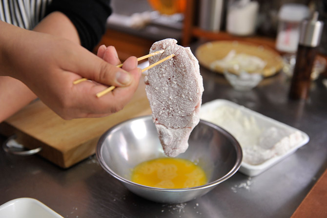 よぶんな粉は、しっかりはたき、溶き卵にくぐらせます。