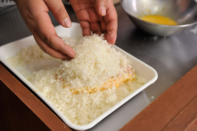 上からパン粉をかけます。たっぷりと、山にしたら。