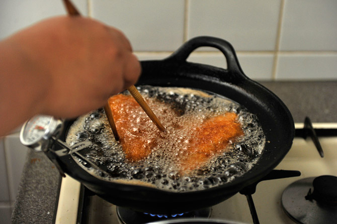 油のなかで、そっとひっくりかえします。