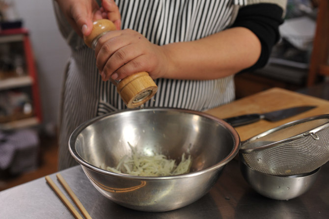 白こしょうも加えて、さっと混ぜておきましょう。