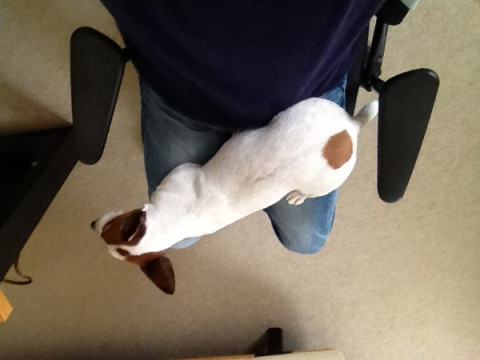 ほんとうに行く寸前には、きゅんきゅん声を出したり、走りまわったりしますが、スタンバイのときには、静かに重みをかけています。