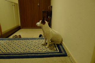 おとうさんは、早く帰ってきたのですが、人間のおかあさんが外出中なので、犬は玄関で待っています。