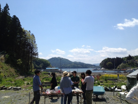 おとうさんたちは、唐桑の海辺て海鮮バーベキューをしてます。