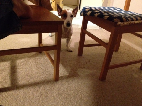 仕事をしているふりをして、片手でカメラを机の下に差し入れ、犬の写真を撮ったのでした。