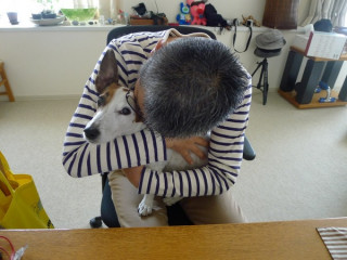 人間のおかあさんの「できあい」は、犬に頭を押し付けるだけですが、おとうさんは、ぎゅうっとします。