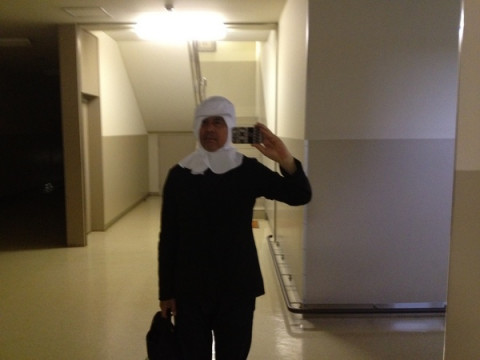 いま白衣を脱いだのですが、まだ頭巾はかぶってます。
